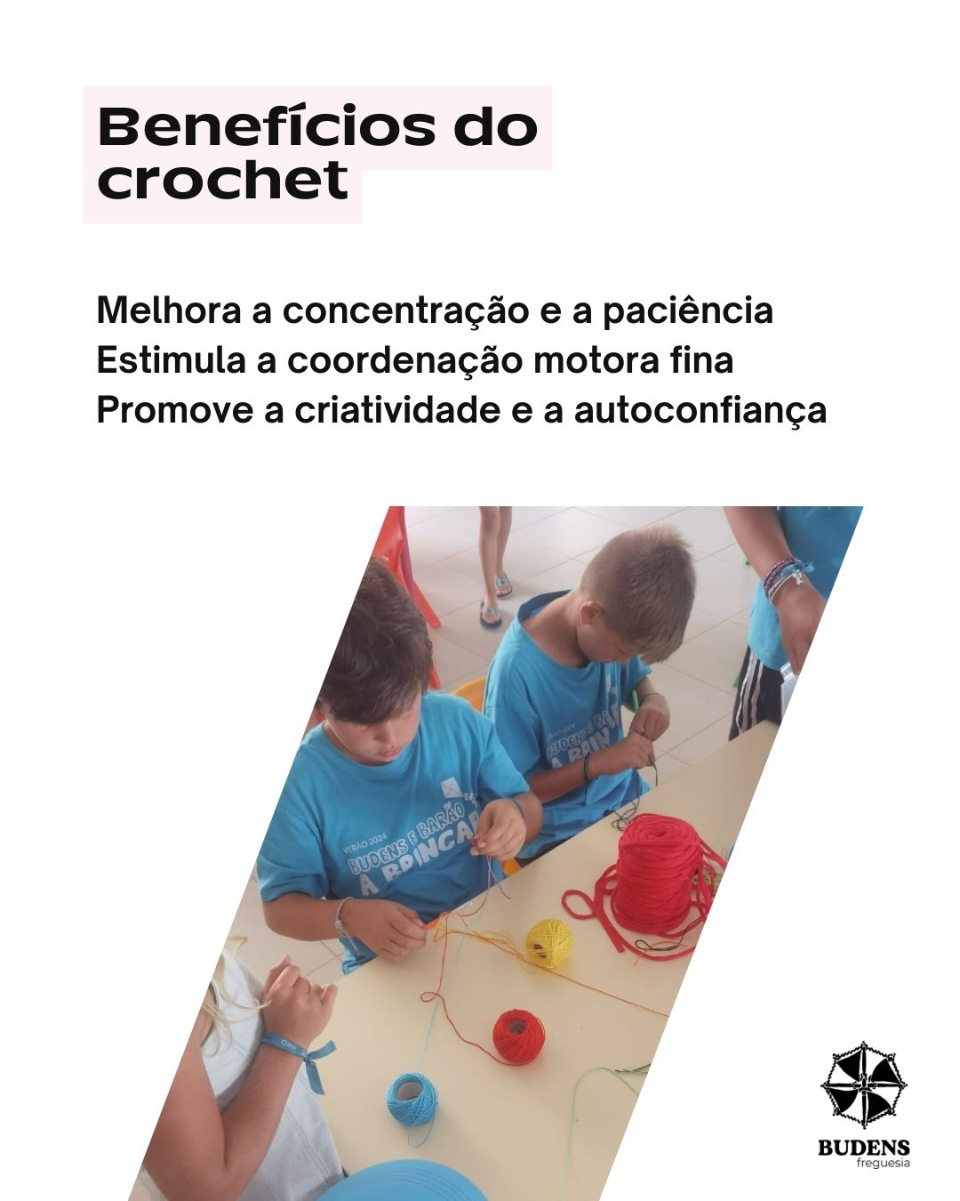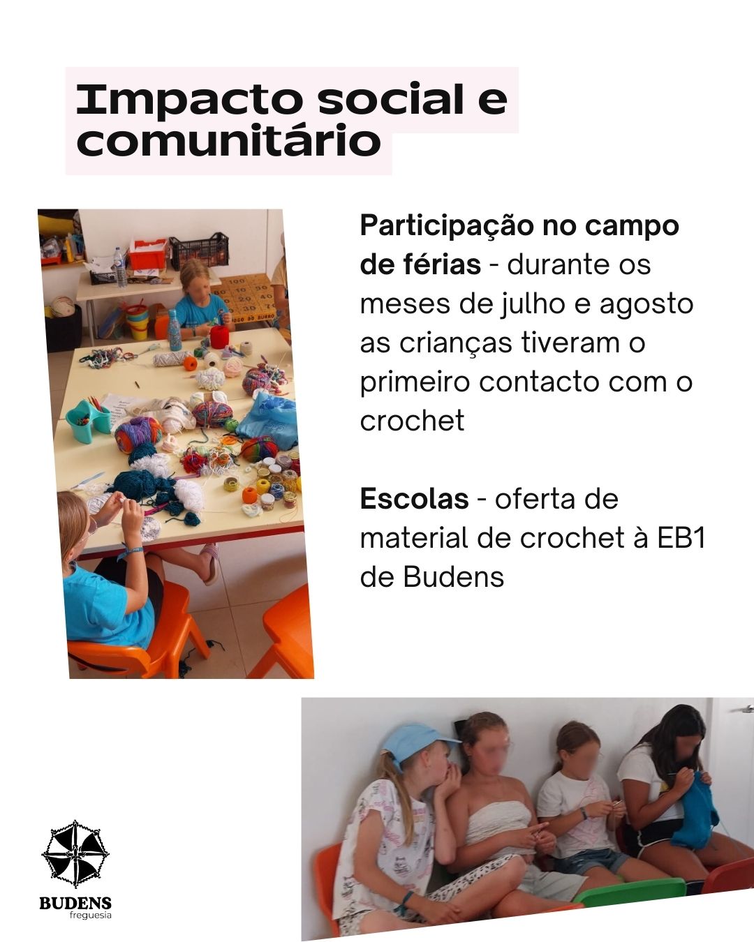 🔹 Participação no Campo de Férias, ensinando o crochet às crianças e mostrando a importância da paciência e da criatividade.